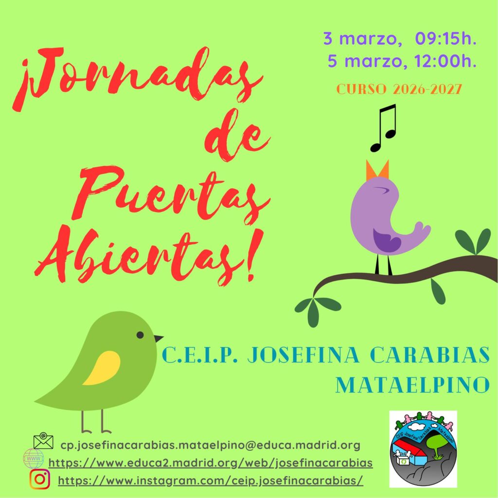 El CEIP Josefina Carabias de Mataelpino organiza sus Jornadas de Puertas Abiertas para el curso 2026-2027, ofreciendo dos fechas para que las familias interesadas conozcan el centro. Las sesiones tendrán lugar el martes 3 de marzo a las 9:15 horas y el jueves 5 de marzo a las 12:00 horas.