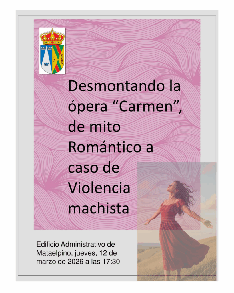 El Edificio Administrativo de Mataelpino acogerá el jueves 12 de marzo a las 17:30 horas la charla «Desmontando la ópera ‘Carmen'». Esta actividad del Mes de las Mujeres propone un espacio de debate para analizar cómo los relatos culturales han perpetuado ciertos mitos y su relación con la violencia de género en la actualidad.