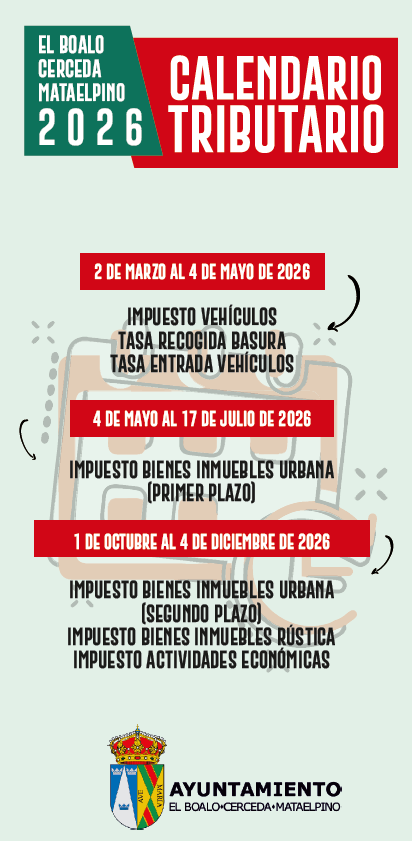 El Ayuntamiento de El Boalo, Cerceda y Mataelpino ha publicado los periodos de pago voluntario para las tasas e impuestos del ejercicio 2026.