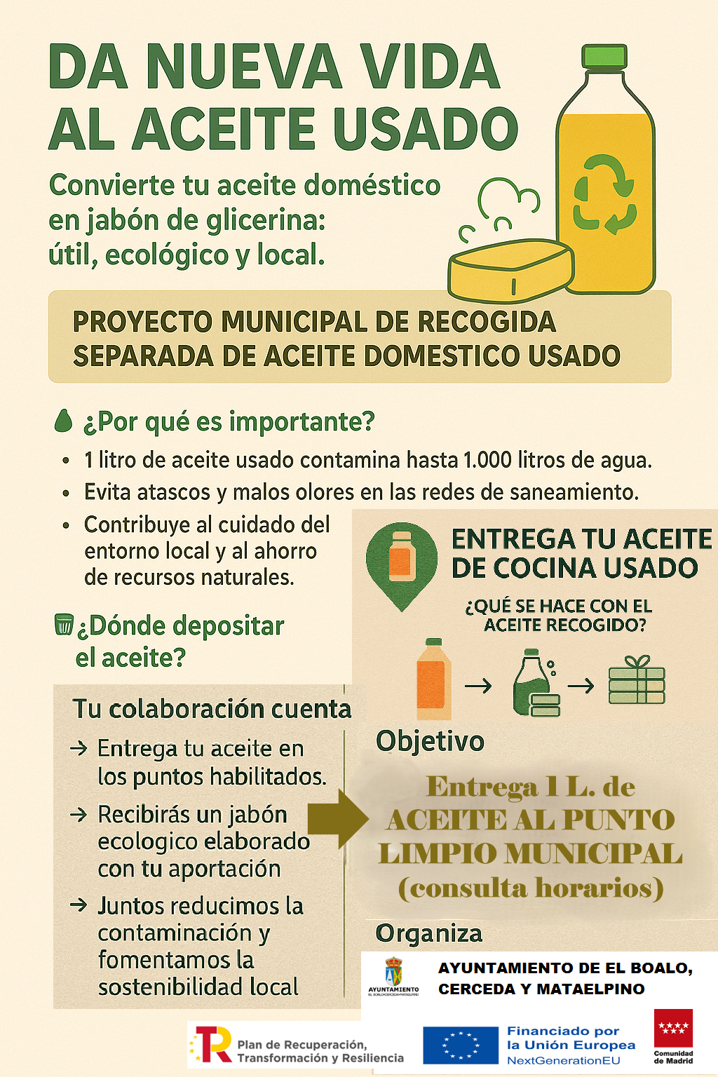 El Ayuntamiento de El Boalo, Cerceda y Mataelpino lanza una nueva campaña de sensibilización para fomentar el reciclaje de aceite vegetal usado y evitar su vertido inadecuado. Esta iniciativa incluye la ampliación de los puntos de recogida mediante la instalación de nuevos contenedores en diversas zonas del municipio.