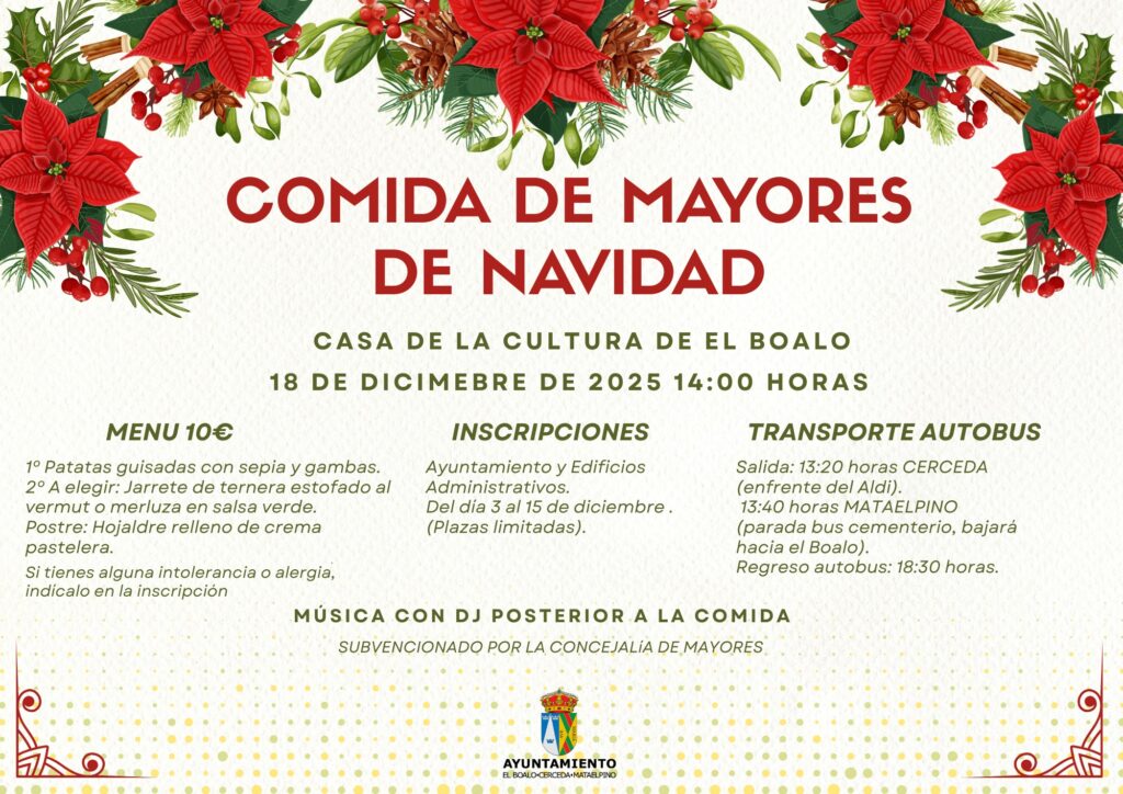 La Comida de Mayores de Navidad tendrá lugar el 18 de diciembre de 2025 a las 14:00 horas en la Casa de la Cultura de El Boalo. El precio es de 10€ por persona e incluye menú y música con DJ.