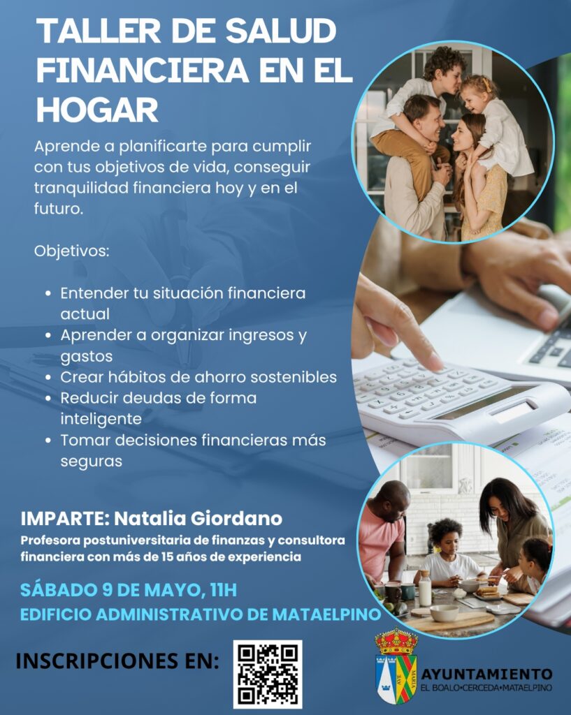 El próximo 9 de mayo a las 11:00 h, el Edificio Administrativo de Mataelpino acogerá el Taller de Salud Financiera en el Hogar. Esta formación gratuita, impartida por la experta Natalia Giordano, ofrece herramientas prácticas para que las familias aprendan a gestionar sus ingresos, reducir deudas y fomentar el ahorro.