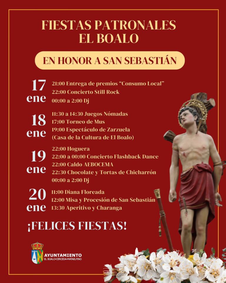 El Ayuntamiento de El Boalo invita a todas las vecinas y vecinos a participar en las celebraciones en honor a San Sebastián, con una programación llena de música, tradición y diversión para todas las niñas y niños, jóvenes y personas adultas.