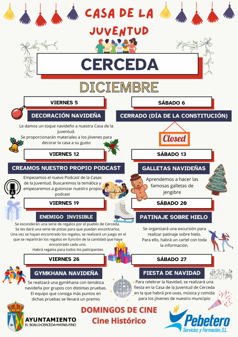 Aventura y Juegos: Se realizará el juego del Enemigo Invisible por el pueblo de Cerceda (Viernes 19), una Gymkhana Navideña (Viernes 26), y una excursión de Patinaje sobre Hielo (Sábado 20).