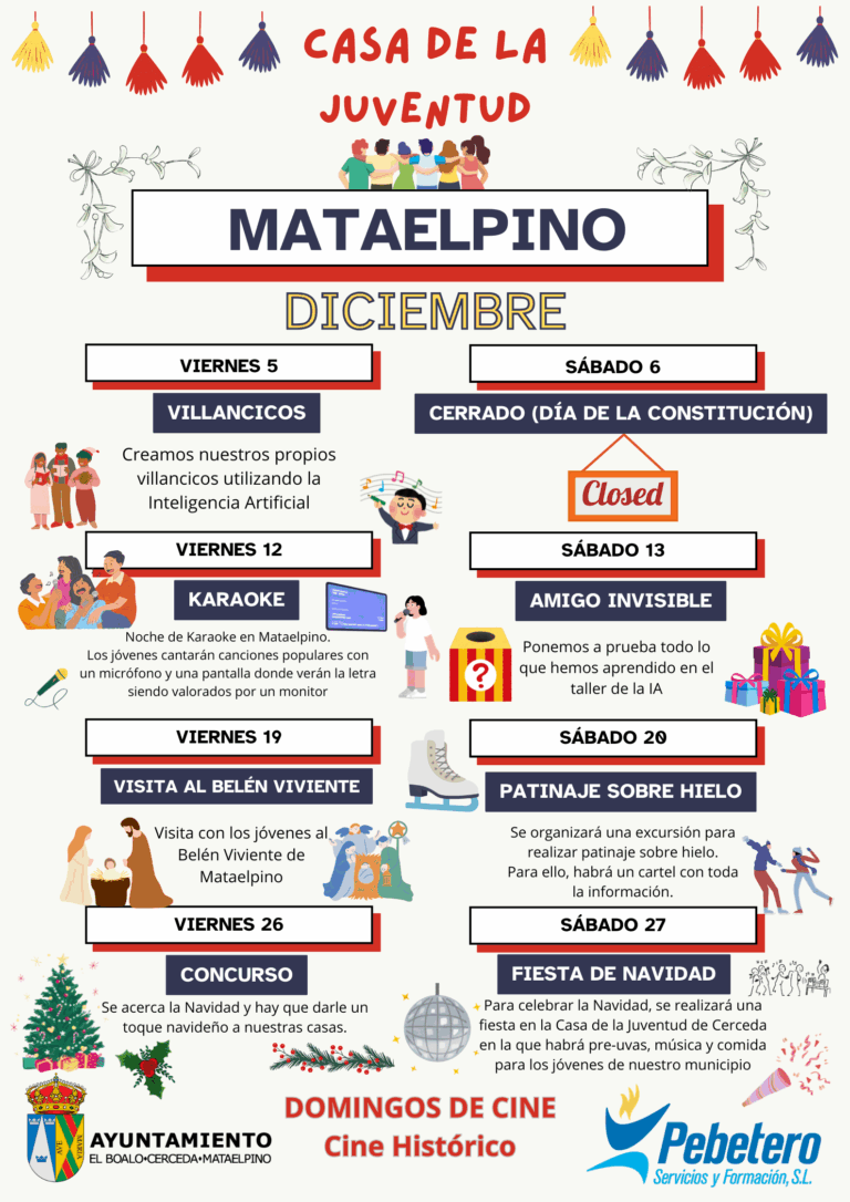 Ya está disponible el nuevo programa de actividades para diciembre en las Casas de la Juventud de El Boalo, Cerceda y Mataelpino, con una temática centrada en la Navidad.